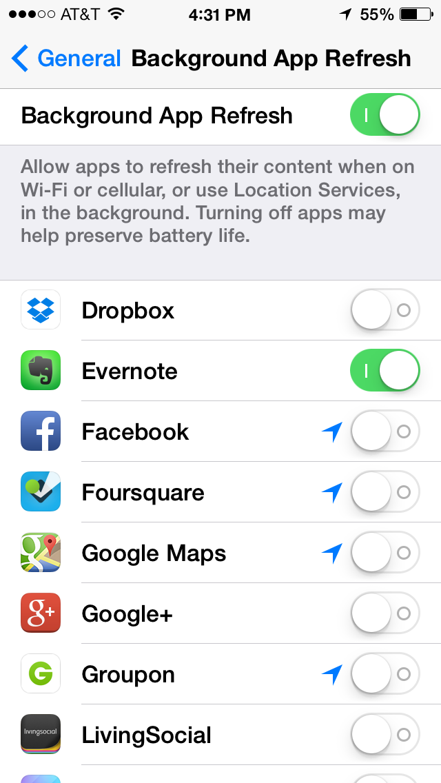 Finally, real multi-tasking comes to your iOS device. Now with iOS 7 you have the ability to choose if you'd like your apps to update while running in background mode. This can be very useful, but, for the iPhone, can also assist in battery drainage, so be careful. Within the General Setting, go to the Backgroup App Refresh setting, and choose which apps you'd like to have the ability to update in the background.